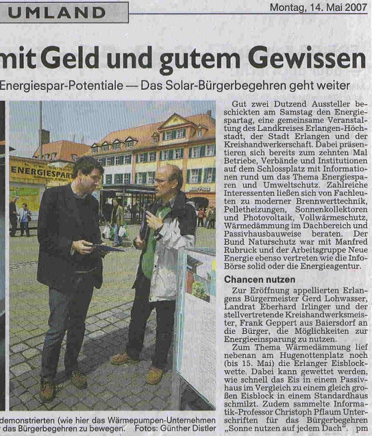 | 26.1.2007 | Öffentliche Diskussionsveranstaltung in Dreycedern - sogar OB Dr. Balleis nimmt sich Zeit. Beschluss über ein Bürgerbegehren zu einer solaren Bauordnung in Erlangen  | |
