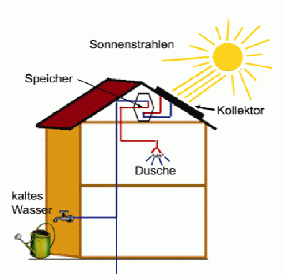 Sonnenkollektoren werden auf Dächern installiert. Sie nutzen das Sonnenlicht um Wasser zu erhitzen. Dieses warme Wasser wird gespeichert und bei Bedarf wird dessen Wärme für warmes Wasser zum Duschen oder zum Heizen des Hauses verwendet.